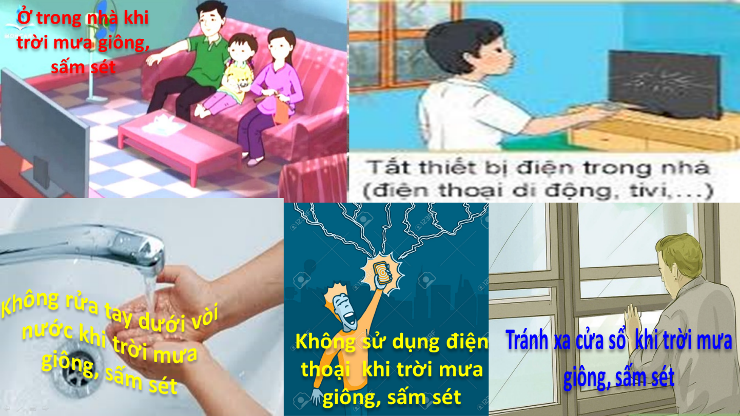 - Khi trời sắp xảy ra giông (mây đen, không khí lạnh, gió) cần vào nhà trú mưa. Khi ở trong nhà, nên đứng xa cửa sổ, cửa ra vào, các đồ dùng điện, tránh các chỗ ẩm ướt như buồng tắm, bể nước, vòi nước, Rút phích cắm các thiết bị điện trước lúc có giông. Với các đường dây điện thoại hay dây điện vì nối với lưới bên ngoài nên rất có thể bị ảnh hưởng sét đánh lan truyền. Bởi vậy nên tránh xa các dây này và các vật dụng điện với khoảng cách ít nhất là 1 mét.