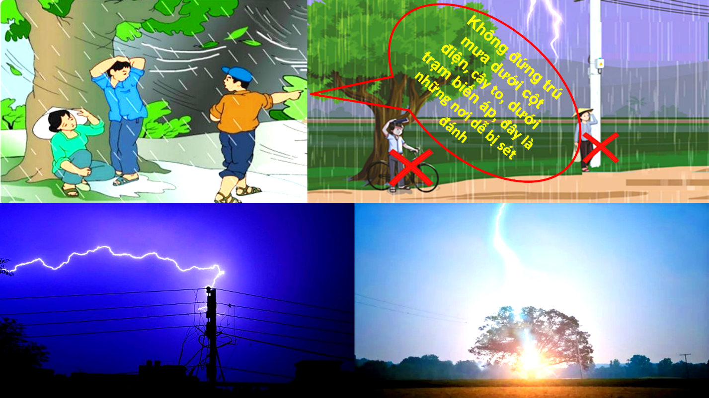 - Khi đang ở ngoài trời, nếu không tìm được chỗ trú ẩn, phải tránh xa các cây cao, không đứng ở đỉnh đồi, không đứng ở các vùng đất trống trải, vứt bỏ các vật dụng kim loại trong người; cũng không đứng, ngồi cạnh cột điện, hoặc đường dây tải điện, vì đây cũng là những nơi dễ bị sét đánh hay dây điện bị đứt nên rất nguy hiểm.