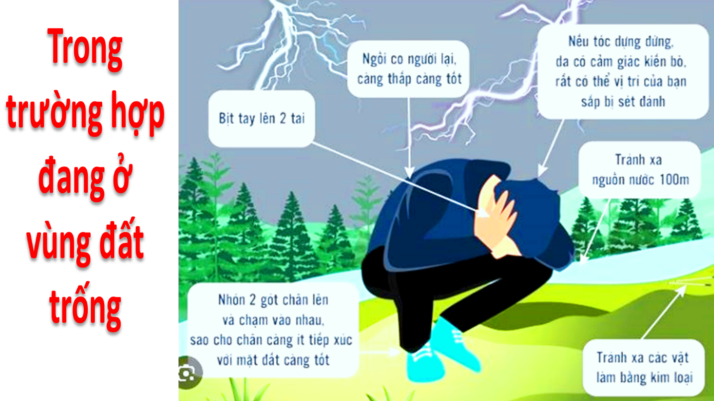 - Trong trường hợp đang ở vùng đất trống nên chụm hai chân, cúi người sát mặt đất (nhưng không chạm hay nằm xuống đất) với hai tay bịt tai… Nếu ở trong rừng thì tìm những nơi cây thấp hơn và thưa để tránh. Không đứng thành nhóm người gần nhau.