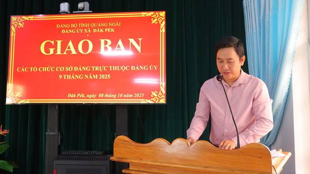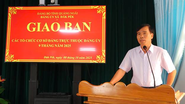 Sáng ngày 08/10/2025, Đảng ủy xã Đăk Pék tổ chức Hội nghị giao ban các TCCSĐ trực thuộc tháng 9/2025 nhằm đánh giá kết quả hoạt động trong tháng 9 và triển khai nhiệm vụ trọng tâm tháng 10 năm 2025. Đồng chí Lê Viết Nam - Bí thư Đảng ủy xã, Chủ tịch HĐND xã Chủ trì Hội nghị. Tham dự Hội nghị có đồng chí Nguyễn Văn Tam - Phó Bí thư Thường trực Đảng ủy xã; đồng chí Nguyễn Thị Thương - Phó Bí thư Đảng ủy, Chủ tịch UBND xã; tập thể Thường trực Đảng ủy; Lãnh đạo các cơ quan tham mưu, giúp việc Đảng ủy; Lãnh đạo Mặt trận và các tổ chức chính trị - xã hội; Lãnh đạo Ban chỉ huy Quân sự xã; Lãnh đạo Công an xã, đồng chí Bí thư các Tổ chức đảng trực thuộc Đảng ủy; Đồng chí Phó Giám đốc Trung tâm chính trị xã.