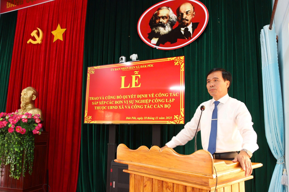 Sáng 10/11/2025, UBND xã Đăk Pék tổ chức Lễ công bố Quyết định tổ chức lại đơn vị sự nghiệp công lập và công tác cán bộ. Theo đó, Trung tâm Văn hóa – Thể thao – Du lịch và Truyền thông xã được tổ chức lại thành Trung tâm Cung ứng Dịch vụ công xã Đăk Pék.
